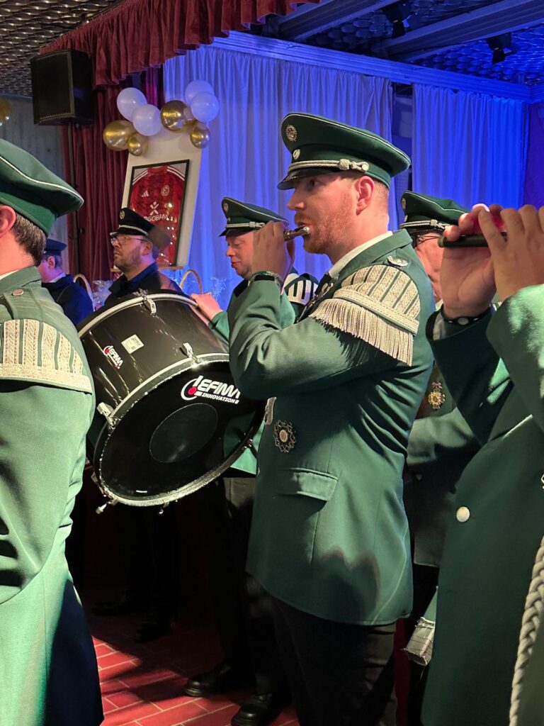 Gratulationscour zu Ehren der neuen Corps-Majestäten.Zu Gast bei musikalischen Freunden unseres Heerdter Tambourcorps in Meerbusch-Büderich. Unser Regimentskönigspaar mit weiteren Mitgliedern ihres „Hofstaats“ aus dem TC Heerdt.