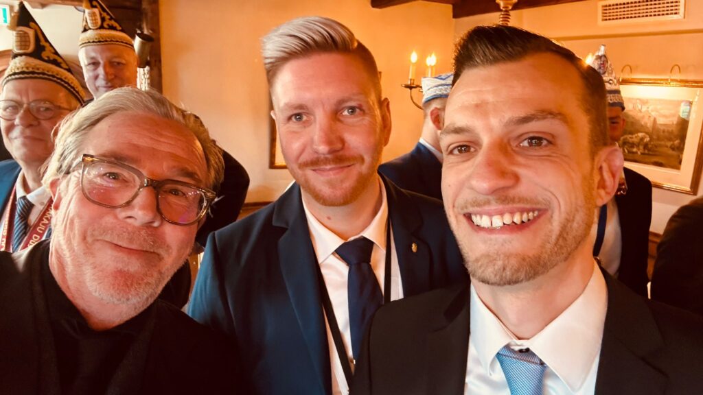 Zu Gast bei der Tonnengarde im Schumacher auf der Oststraße zum traditionellen Schwänzkesessen: Protektor Peter Jung, Regimentskönig Dennis Kamp und der 1. Chef Nils Bessert (v.l.n.r.)